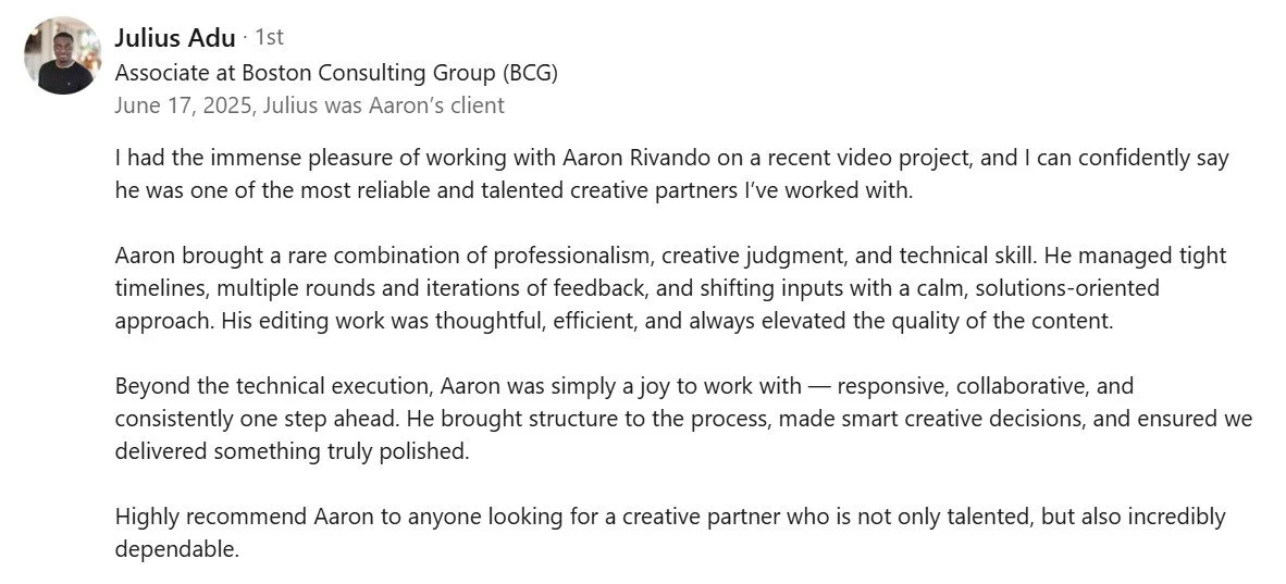 "Aaron’s skill and attention to detail really stood out. He went above and beyond.”